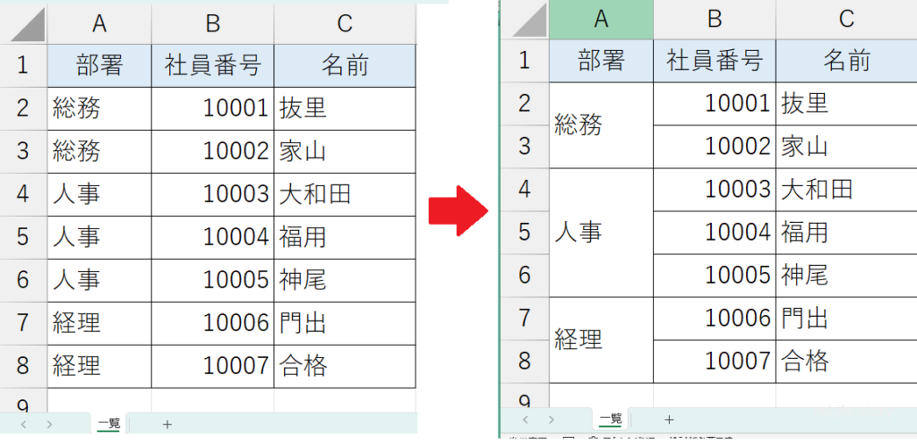 エクセルでセル結合を使うことは、特に見栄えを整えたいときに非常に便利です。たとえば、部署ごとに社員データをまとめる際、以下のような表を作るときにセル結合がよく使われます。