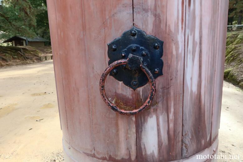 この鉄の輪は、春日祭や若宮おん祭の際、神事の始まりを示すのに大榊(現在はなぎ)を立てられます。