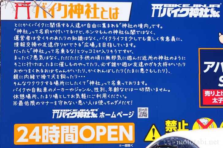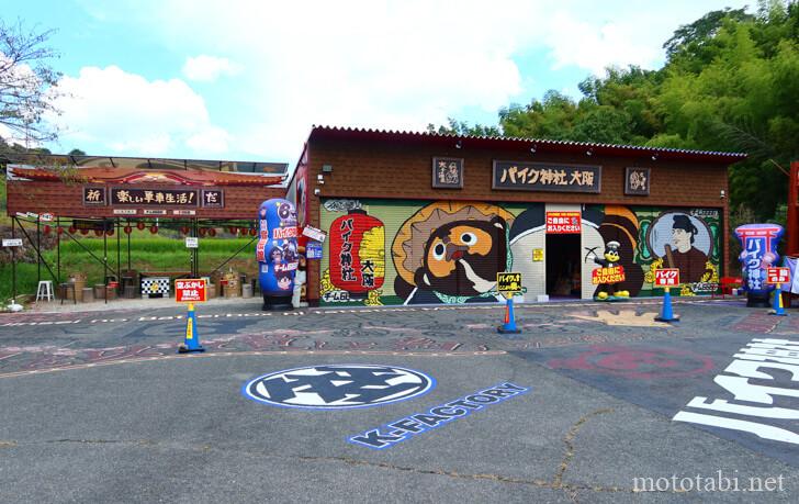 バイクで訪れると割引がある日もあります。私が行った日は偶然にもバイク割引デーでした。敷地内には車中泊スペースや「バイク神社」もありますが、この神社は本物の神社ではありません。